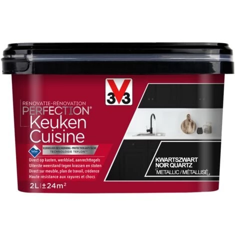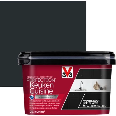 La peinture cuisine V33 Rénovation Perfection noir quartz métallisé 2L s’applique sur les meubles de cuisine, crédences, plans de travail et électroménagers, neufs ou anciens et ce quel que soit leur matériau tels que le bois brut, vernis ou peint, le mélaminé ou stratifié, le carrelage murau, plâtre, verre, plastique et métal. La technologie TeflonTM empêche aux taches d’adhérer, pour une résultat parfait et durable. Comptez 6h entre 2 couches et 24h pour un séchage complet évitant ainsi les catastrophes. La peinture sera nettoie aisément à l’eau. Quel bonheur de cuisiner dans une aussi belle cuisine !