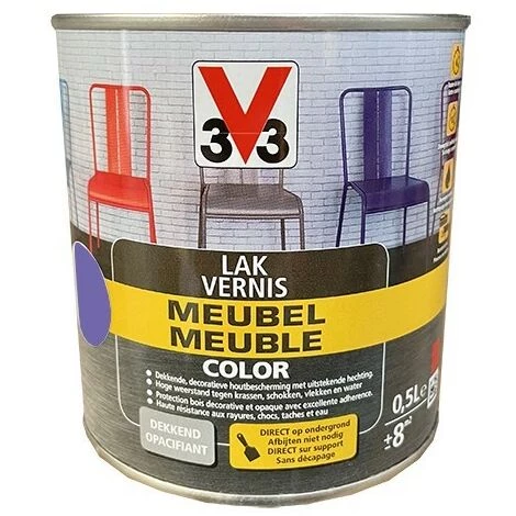 V33 Vernis Meuble Color apporte au bois une protection décorative opacifiante satinée. Elle assure une excellente résistance aux chocs, aux rayures, aux tâches et à l’eau. S’applique directement sur tous types de supports à rafraichir: bois, vernis, bois plaqués, stratifiés, mélaminés, OSB, mdf… Restriction: Ce produit ne peut être expédié vers la Belgique