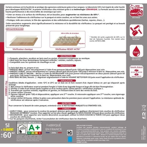Passages Extrêmes® – Technologie Céramique V33 vitrifie vos parquets, planchers et escaliers en bois pour une protection durable. La technologie céramique que ce vitrificateur V33 contient assure une résistance renforcée et protège vos sols contre les agressions quotidiennes (passages répétés, rayures, taches et chocs).